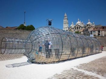 Una gigantesca bottiglia, tanto grande da poterci entrare dentro, dall'aspetto abbandonato e leggermente interrata, come se emergesse dal suolo, è comparsa nel mese di giugno a Parigi. Si tratta in realtà di un'installazione artistica realizzata utilizzando ben 3.000 bottigliette in Pet per ribadire che "L'acqua è di tutti", come sottolinea il titolo dell'opera di Manolo Benvenuti, Claudio Ballestracci e Giulio Accettulli. E' arivata a Parigi in occasione del festival Fontaines en Scéne all'inizio di giugno. L'installazione è sostenuta da Ambiente Festival e da un gemellaggio fra i comuni di Rimini e Périgueux (Francia) e sviluppa il tema dell'acqua come bene sociale e relazionale. Dopo Parigi, l'installazione sarà a Ginevra dal 2 al 12 agosto. All'interno della gigantesca bottiglia, che funge da auditorium, ci sono quattro fontane sonore: quando ci si avvicina, il flusso dell'acqua si arresta e al suo posto sgorga la musica. L'esecuzione è completa solo quando si suonano tutte e quattro le fontane, come in un quartetto d'archi. Nelle varie fasi della realizzazione di "L'acqua è di tutti", sono stati coinvolti amministratori, scolaresche, associazioni, volontari, allo scopo di dare vita ad un progetto che vuole far riflettere sul consumo di acqua e sulle implicazioni economiche e ambientali che questo comporta: sfruttamento industriale di un bene comune, cattivo utilizzo e sprechi, smaltimento della plastica, inquinamento. Per realizzare la copertura sono stati condotti laboratori con scolaresche dai 10 ai 19 anni, che a partire da un container stipato di rifiuti plastici, oltre che dai sacchi forniti dalle stesse scolaresche chiamate a selezionare e conservare i loro rifiuti domestici, sono state recuperate le bottiglie in Pet. Ogni singola bottiglia è stata selezionata, privata dell'etichetta, lavata, separata dal collo e dal fondo, appiattita a mano e successivamente stirata col ferro, ritagliata a mo' di tessera, perforata e infine affissa alle reti di supporto. Al termine dei laboratori sono state inoltre mostrate altre applicazioni degli elementi decorativi in Pet, ottenute utilizzando la stessa tecnica di lavorazione.