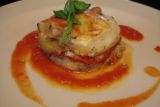 Parmigiana con gamberi e cozze in un letto di seppie e bufala